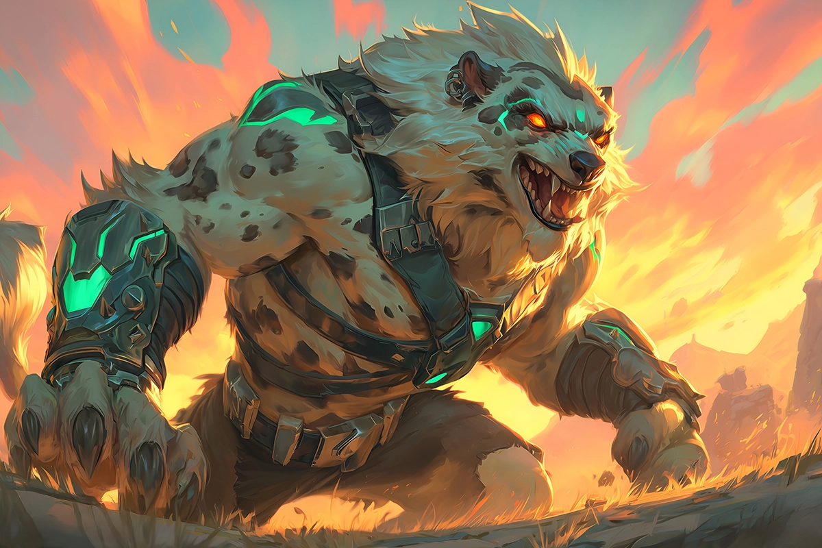 No one can tell how many corpses have been left in Noxus' wake, nor can anyone tell how many people of their own have they lost. To them, death is nothing more than a conduit to further their ambition of expanding their empire. They care little for who will die, they or the opposition, as long they move forward, never stopping, never distracted by the mountain of cadavers they leave behind. However, the twisted ideology of Noxus and their dogma of military enlistment don't just limit itself to humans, or any other sapient being for that matter. However, it would not have come to them were it not for their moral antithesis and mortal enemies, Demacia. Always standing against them, never relenting, it is very unlikely that there will ever be peace between these two great nations. But Noxus does learn from their experience and especially from that one battle where they nearly lost the entire platoon. Realizing that men is not enough to complete whatever task is given to them, Noxus aspired for something that's even more, how to say, obedient… but just as powerful as any other Noxian. Using their relations in Zaun, the Noxian higher-ups concocted a plan that would aid them very well in the future. Though it took several months, it finally happened: a pup. Everyone was at disbelief. What can an infant dog accomplish for the great nation of Noxus? Though it wasn't apparent at first, but this "pup", named Aeternus, would soon stand above most of the Noxian soldiers. He was no mere canine. Aeternus was in fact one of the most recent project of Zaun's greatest minds. A beast who is not only composed of Murk Wolf blood, from which it gains it's ferocity, but also that of a Badgerbear, chosen not only for their size, but also as a mockery to the proud nation of Demacia. With size, teeth and claws to his advantage, Aeternus started his training to become a Noxian soldier, in what would be the prelude to the death of many people in the future. Over the years, Aeternus joined many skirmishes and invasions, crushing bones with his massive jaws and eviscerating anyone who was unfortunate enough to get in his way. 22 years later, Aeternus has far exceeded the life expectancy of a regular canine, and he's still going strong, always hungry for more meat, only to pick it out between his teeth. However, this would soon change, as an old dog can only go on so much. During one invasion, seemingly successful at first, one enemy managed to throw a grenade in a hopeless effort to save his home. As he closed his eyes, the last thing he saw was the explosion he had set off. If he were to live he would've taken pride in the fact that he had seriously injured Aeternus, one of Noxus' greatest contributors to its agenda. With his left front leg now amputated, there doesn't seem to be too much hope for an old dog past his time. How is an old dog past his prime with one leg missing going to catch prey between his teeth? Regardless of the answer, Aeternus was planned to be mercy killed, as his service to Noxus was now over. However, as the man in charge of his euthanasia came back to the chamber, only leaving for a moment, there he found something that would defeat any Noxian's expectations: eight dead bodies, mutilated beyond recognition, with the walls painted red and the ceiling decorated with viscera. And in the middle, a giant dog with three legs, breathing hard with bones stuck between his teeth. Amazed as though he saw the most beautiful in his life, the man now knew that putting Aeternus to rest would be a waste, as even in old age can he still take on several Noxian soldiers. So with the revelation of Aeternus' triumph over death, he was reinstated back to army. Though now equipped with a mechanical armor to further assist him in his crippled state, even when he's no longer able to run, Aeternus can still reach his prey, and once does, he destroys them between his massive jaws. For he might be old, but he refuses to die. Because old habits die hard. Or in this case, a giant dog.