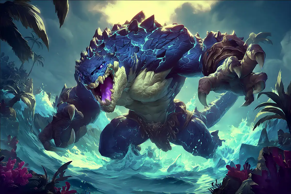 If one were to enter the Void, they would most certainly not live to tell the tale. However, if one were to enter the Void and indeed make it out, their mind would be too shattered to ever communicate properly, let alone tell of its content. As far as anyone in Runeterra is concerned, the Void is nothing more than a violet nothingness, whose inhabitants are nothing more than agents of destruction. But what people don't know is that there is more to the Void than what it shows. The creatures who once inhabited it, who somehow made their way to Runeterra, somehow, somewhere, have a lot to tell of what transpires there, even if they can't sit down and talk to you about it. Does it have earth? Maybe. But there is one Voidborn in particular whose existence alone gives off the knowledge that there are indeed oceans inside the Void. Or at the very least, 'were'. Though his conquest continues to drain all the bodies of water in Void, Batz'Yab is attracted to what little moist environments remain. His life's work near complete, he suddenly found himself at a halt when he inexplicably found himself in Runeterra, much like some of his brethren. Now with more oceans to behold, his insatiable thirst will find a new liking to a new place. This drinker of seas will instinctively devoid the world of all forms of water, be they fresh or salt. And if he isn't stopped, Runeterra will be nothing but air and dirt. But who can?