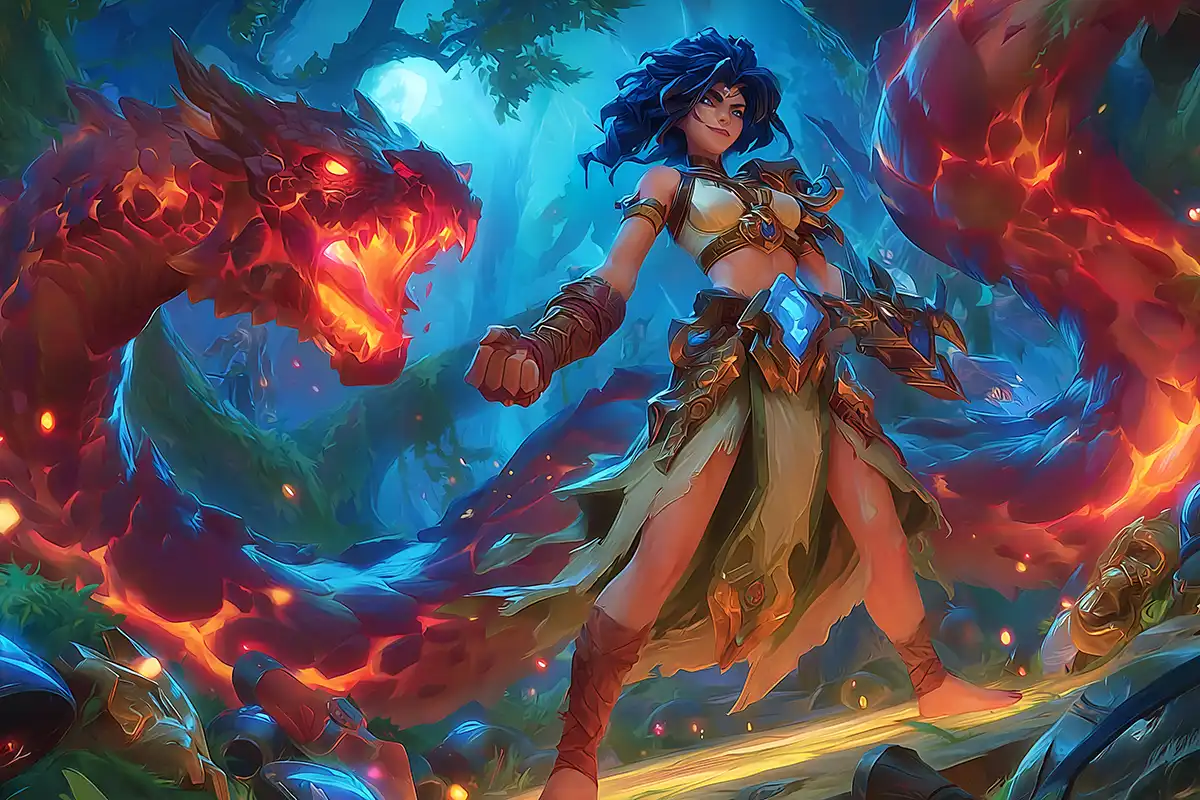 Many Ionians have lost their families to the Noxian invasion. Orphaned; traumatized; left with nothing. Fortunately, Ionia prevailed, and the warmongers were pushed, albeit at the borders of the First Lands. But in no position to make another move after they realized their might of those that stand against. Despite this, what has lost cannot be returned. And some of the casualties no this rule more than others. Hirunda is such an example. Born to Ionian farmers, she witnessed before her firsthand how her family was eviscerated and her farm razed to the dirt by just another Noxian, whom his fellowmen recognize him as one of them. But to Hirunda, he was the man with no left ear. Years later, after things have calmed down, Ionia tried to return to the peace. Easier for some; harder for others. But for Hirunda, the hardest. Not letting go of the rage within her, she tried to singlehandedly assassinate the one who would not leave her mind. And though it took her a while, she finally found him. There he was, the man with no left ear, on the thin border between Ionia and Noxus. Now was her chance, and with no second thought, she jumped right at him. Of course, when you're a rage-filled girl against a battle-hardened warmonger, what would not expect success. As he tossed her onto the ground, she ran, and him after her. Running without thinking, and chasing with the intent of killing. He finally caught up with her when he threw a rock to her leg. As she fell on the ground and against a tree, knowing not where Ionia she even is, there he stood tall in front of her, eager to snap her neck. As she realizes her imminent demise, a miracle suddenly happened. A red miracle, scaly and long. Falling down from the tree above them, the red creature swallowed the man whole. And while the man struggled inside the creature's stomach, he would soon yield, and the struggling would cease. That's when the creature spat out man, now nothing but a disheveled corpse and slimy armor, deprived of all its nutrients and fluids. The creature saved her life, but it was about to end it too. Or so she thought, as the red creature found a liking to her immediately. Relieved, she soon understood that the creature in front of her is in fact a Hungry Dragon. One of several species of dragons in Ionia; known for its small size and its habit of eating their meals whole before regurgitating it, absorbing only the essentials of the food. These pesky fellows can devour an entire herd in a single night. And as time went by, Hirunda and Bolyn, as she would name him, formed an unbreakable bond. They moved on with their life, and Hirunda found a new purpose for herself. Not letting go of her vendetta against Noxus, she would devise a plan to completely push them back and away from the First Lands: have Bolyn devour all of their food supply, every night, one at the time. The famine will force them to go away. And maybe Hirunda will be the hero that Ionia never heard of. But hopefully for her, she will succeed…