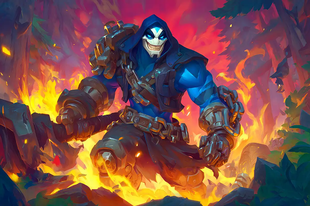 Keith is a man in his late 40s. He wears a black blazer that completely covers his body to protect him from all the fire he creates all the time. He wears a hood too and his attire in general has Noxian motifs to it to signify his allegiance. His Right arm is robotic, courtesy of Piltover and the only remnant he has from it, which is also equipped with chains in addition the his signature flamethrower. He carries a mechanical pole, which he calls the Stake, on his back that releases fire. But his most notable feature is his nasty grin.