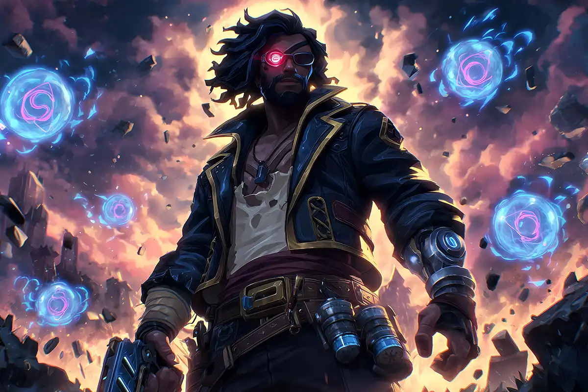 As the lore implies, Lokan comes from a region in Runeterra that none of the existing cultures are familiar with. First off, he's an illegal arms dealer, so he should look as such, probably also wearing black clothing to represent his shady disposition. Second, his appearance gives off the implication that he comes from a culture that even more technologically advanced than Piltover, whereas the latter is more steampunk-ish in design, the culture that Lokan represents is more modern-day sci-fi-esque. He is also equipped with futuristic-looking technology, specifically weapons. Oh yeah, and he has a robotic left eye.