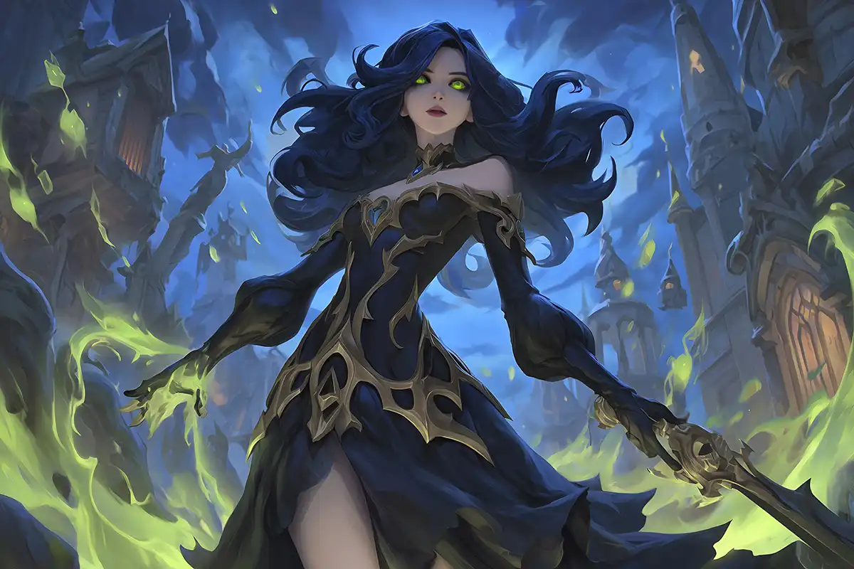 Nangyara is a superior wraith of the Shadow Isles. She is a green ethereal entity wearing black garments fitting for a wraith that stands above the other souls of the Shadow Isles. Her two most iconic paraphernalia, as the lore would suggest, or a disheveled doll, seemingly once belonging to a child, in her right hand, and a curved dagger in her left hand.