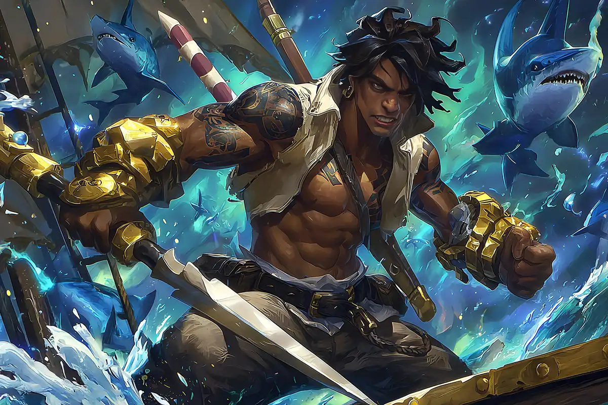 Redder is a Bilgerat with olive skin. He is shirtless as per a fisherman who does everything by himself at sea, wearing only Bilgewater pants. His torso is covered in various tattoos with Bilgewater motifs. On his right forearm, the rattle made of seashells is wrapped around it, which he uses to attract the sharks. He carries with him customized swords (which for some reason are referred to by him as Shark Spears) on his back which, for lack of a better description, have the color scheme of candy cane, so that it would appear bright and colorful to the eyes of a shark, further attracting it.
